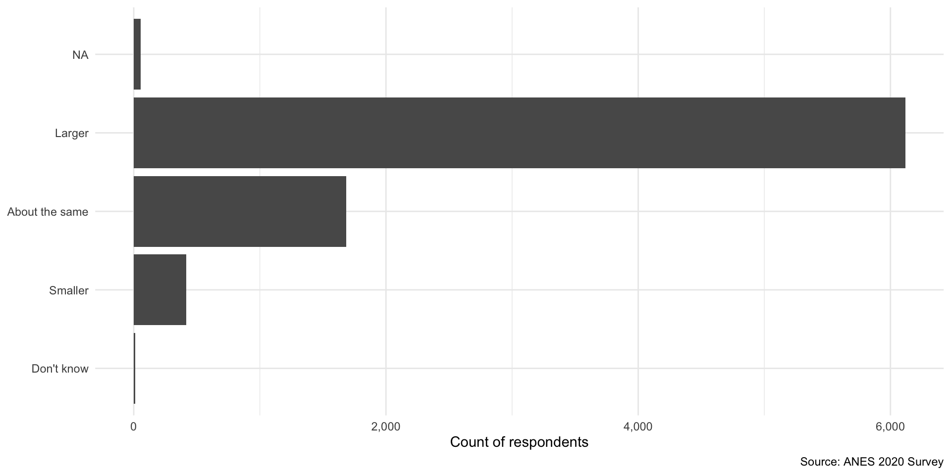 Let’s take a look at how you can describe these different types of variables using real-world political science examples. Generally, we can get a good sense of a categorical variable by looking at counts or proportions. For example, which category contains the most number of observations? Which contains the least?