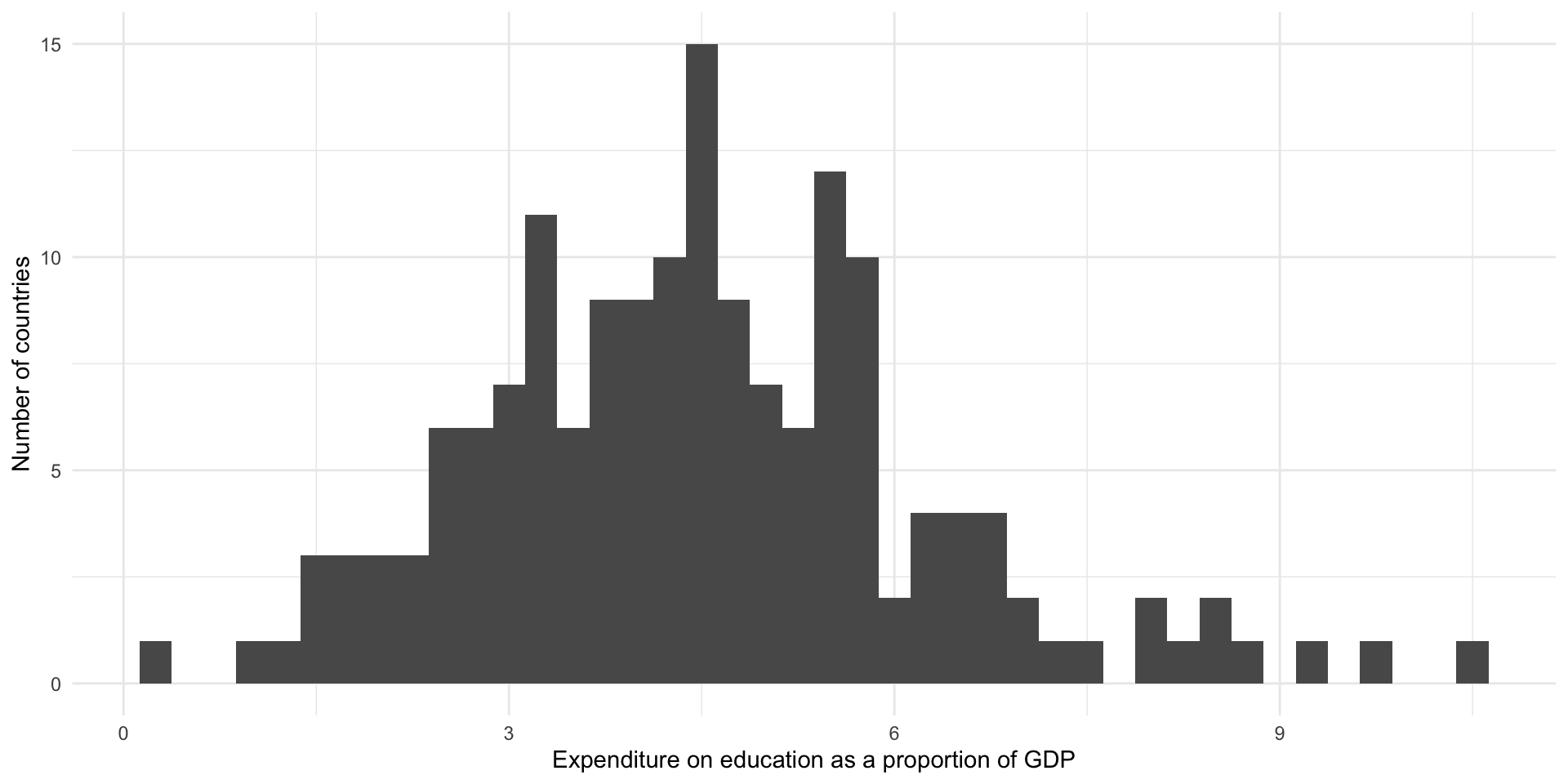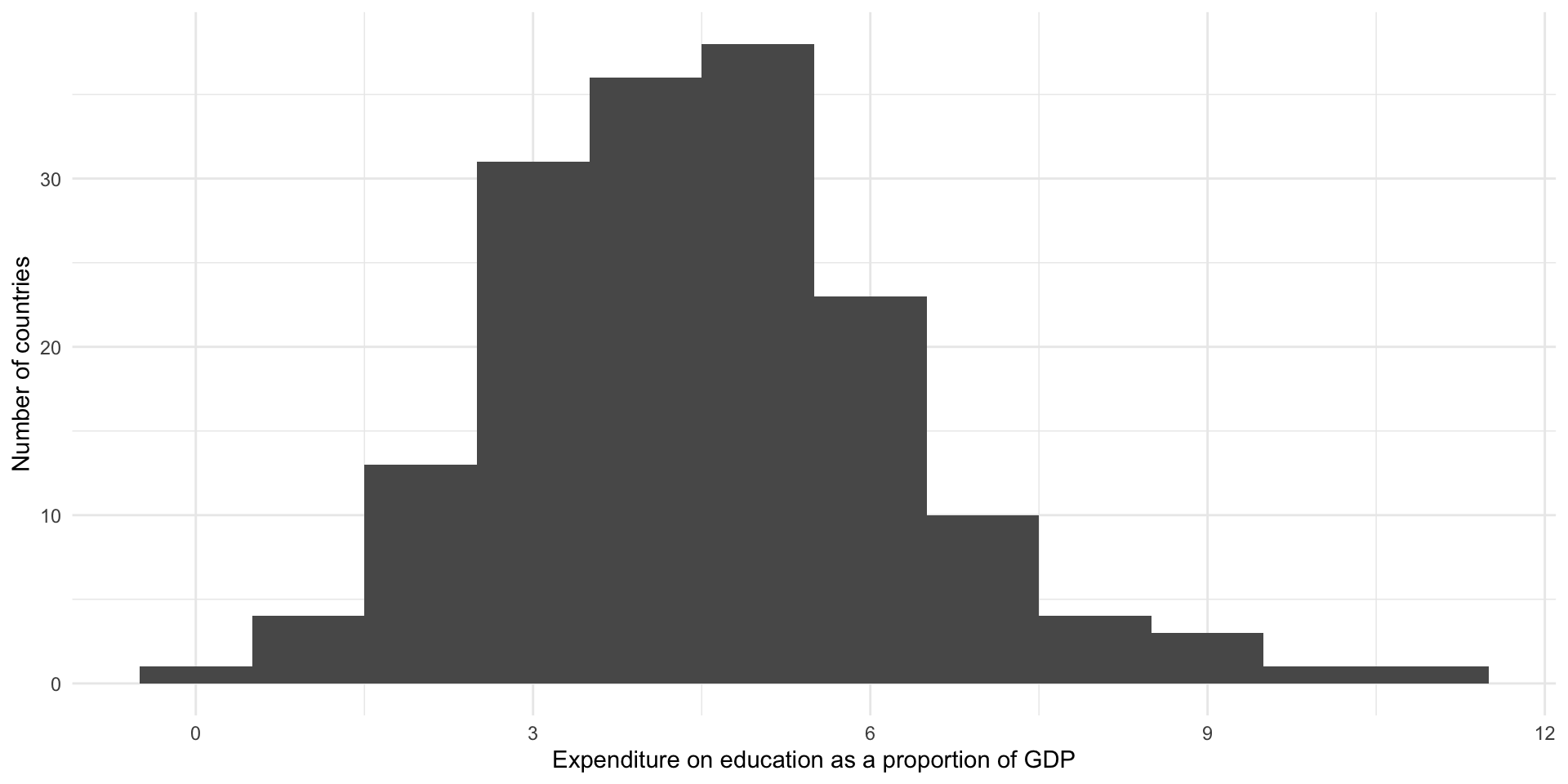 The standard deviation of all countries’ percentage of their GDP that they spent on education in 2020 was 1.75%. This horrible sentence demonstrates that standard deviations are most usefully employed in contexts other than attempts to better describe your variables of interest. For example, they are very important for determining how certain we can be about the relationships between different variables we uncover using statistical models (which we will get to later in the course).