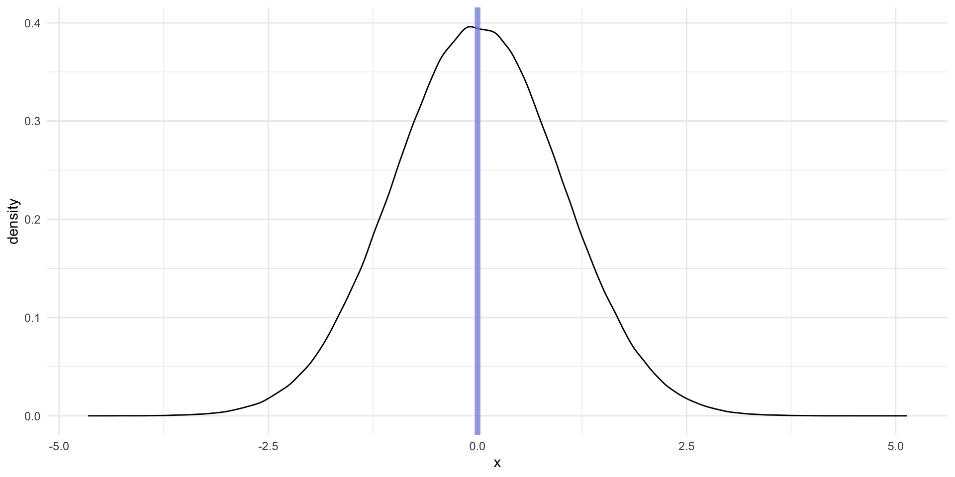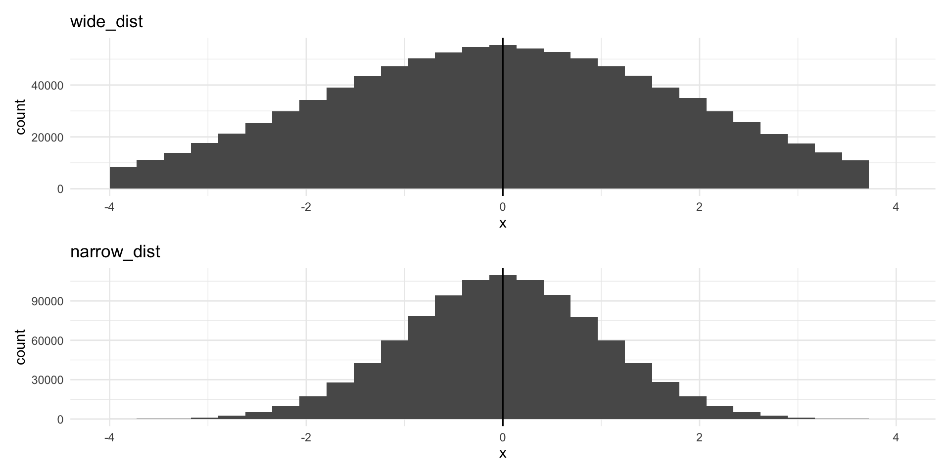 This measure can, at first, be a bit too abstract to get an immediate handle on. Let’s walk through it. Imagine we have two data sets, wide_dist and narrow_dist. Both are Normally distributed, share the same mean (0), and the same number of observations (1,000,000).