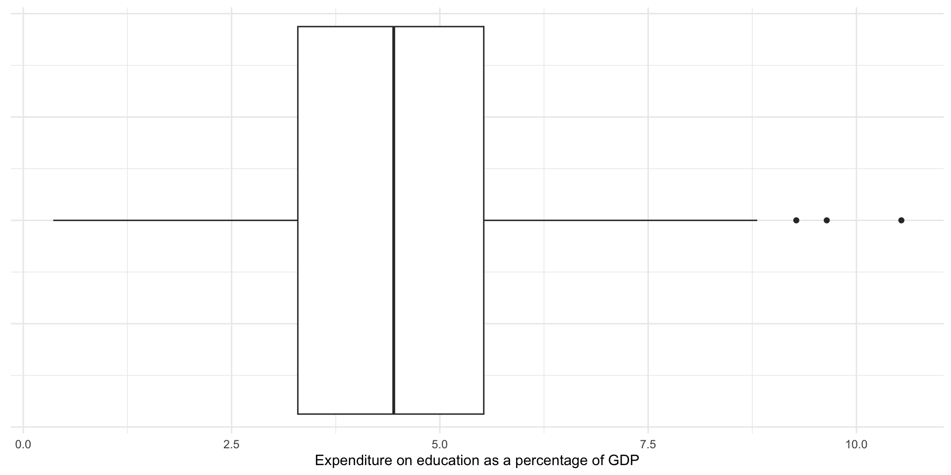 Note that some countries’ expenditure are displayed as dots. The box plot above is providing you with a bit more information than the five number summary alone. If the data include values that fall outside of the IQR, they are displayed as dots. These are (very rule of thumb, take with a grain of salt, please rely on your theory and data generation process instead!) candidates for outliers.