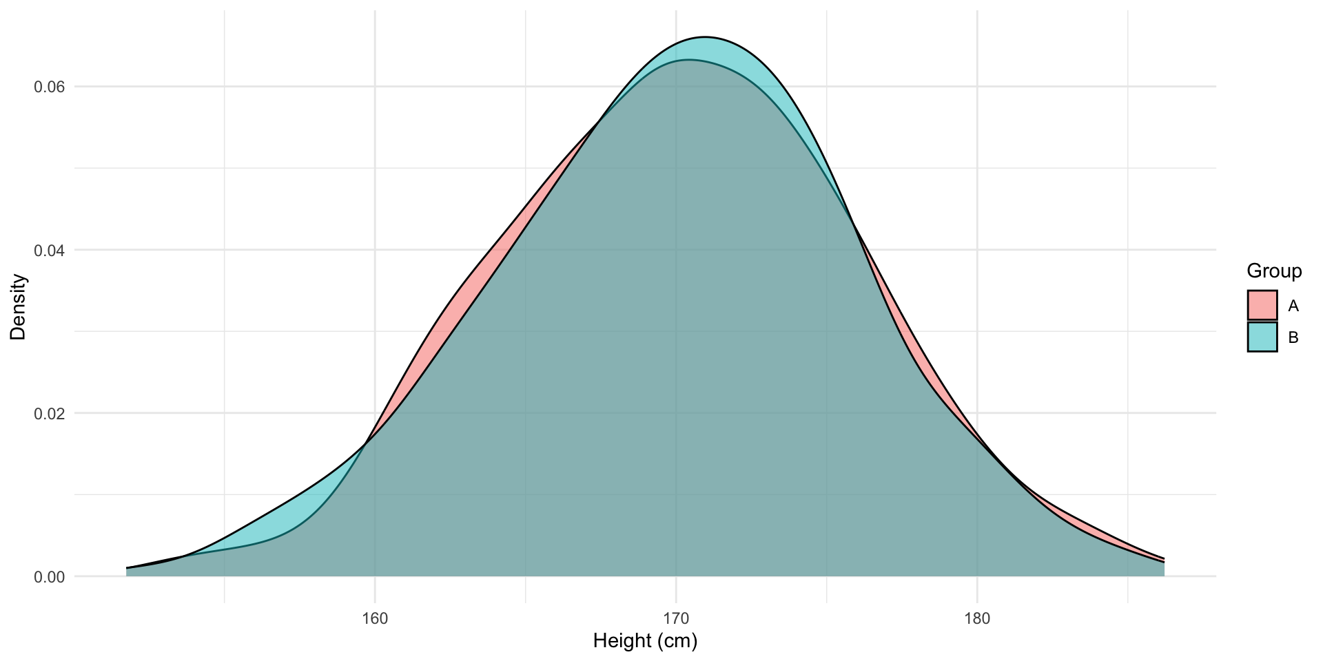 The distribution of heights among individuals in groups A and B are roughly identical. The average height of individuals in group A is 170.1 cm and in group B is 170 cm. Pretty neat!