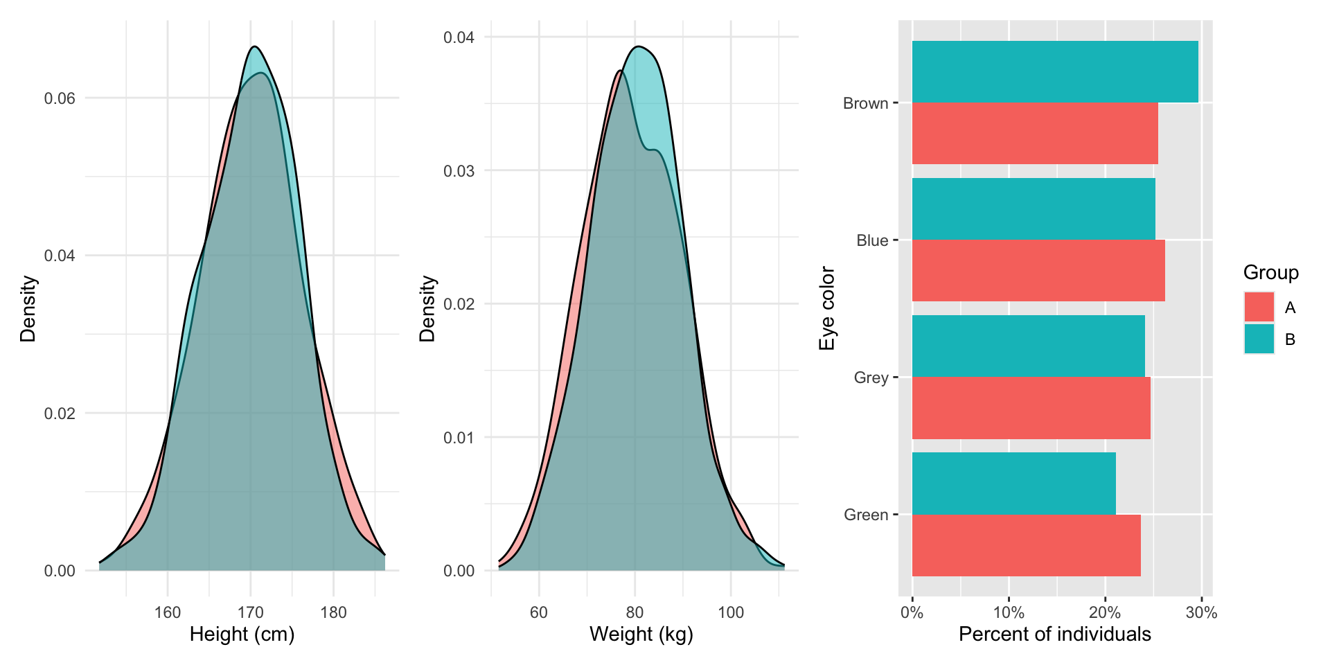 Again, the proportion of individuals within each group with each eye colour are roughly identical. This is all due to random assignment.