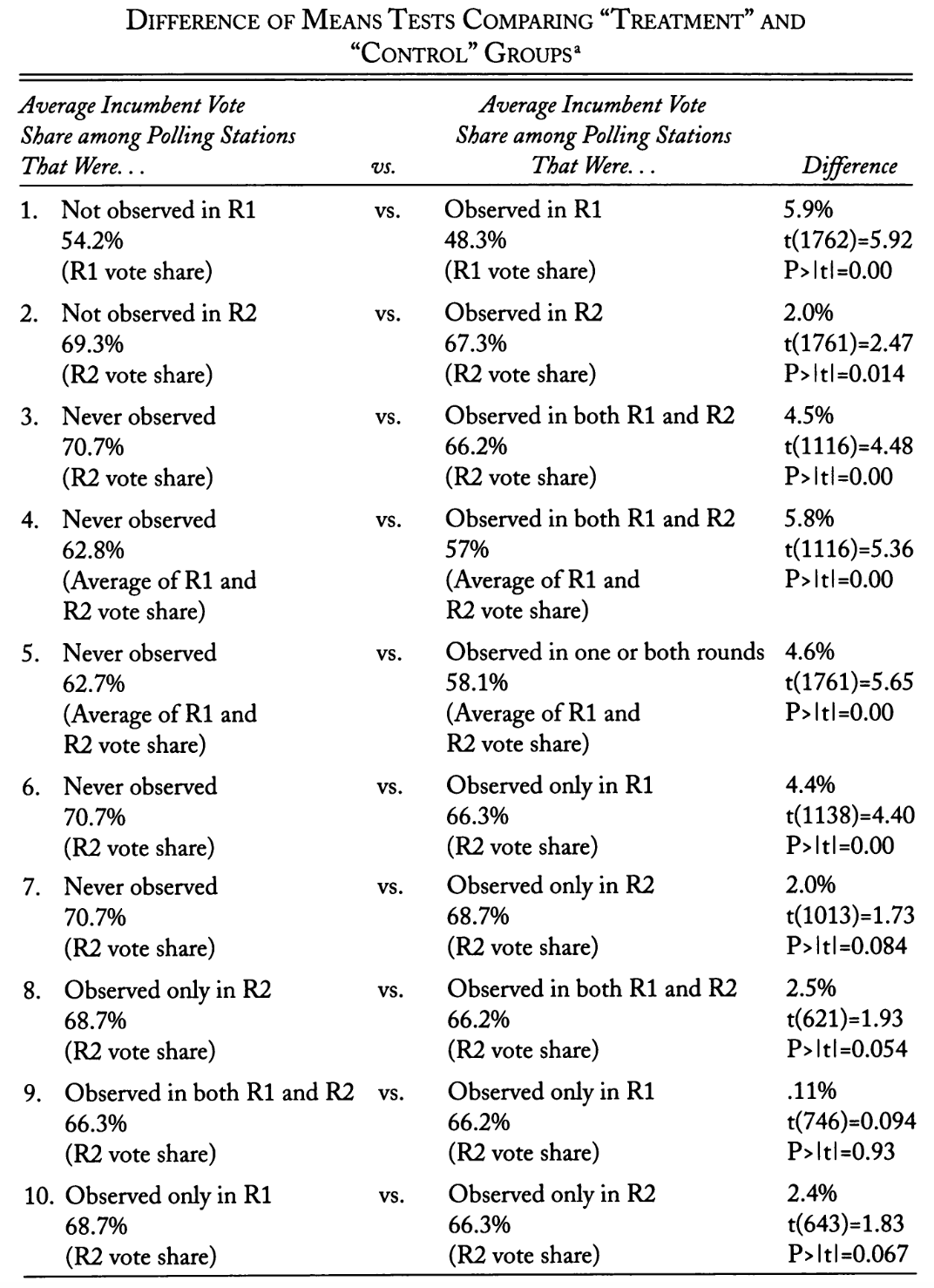 Let’s step through the first row together. Monitors were assigned randomly to election booths. Among the booths that were not observed in round one, the incumbent received 54.2% of the vote. Among the booths that were monitored, however, the incumbent only received 48.3% of the vote. This is a difference of a whopping 5.9% of the total vote share in round one.