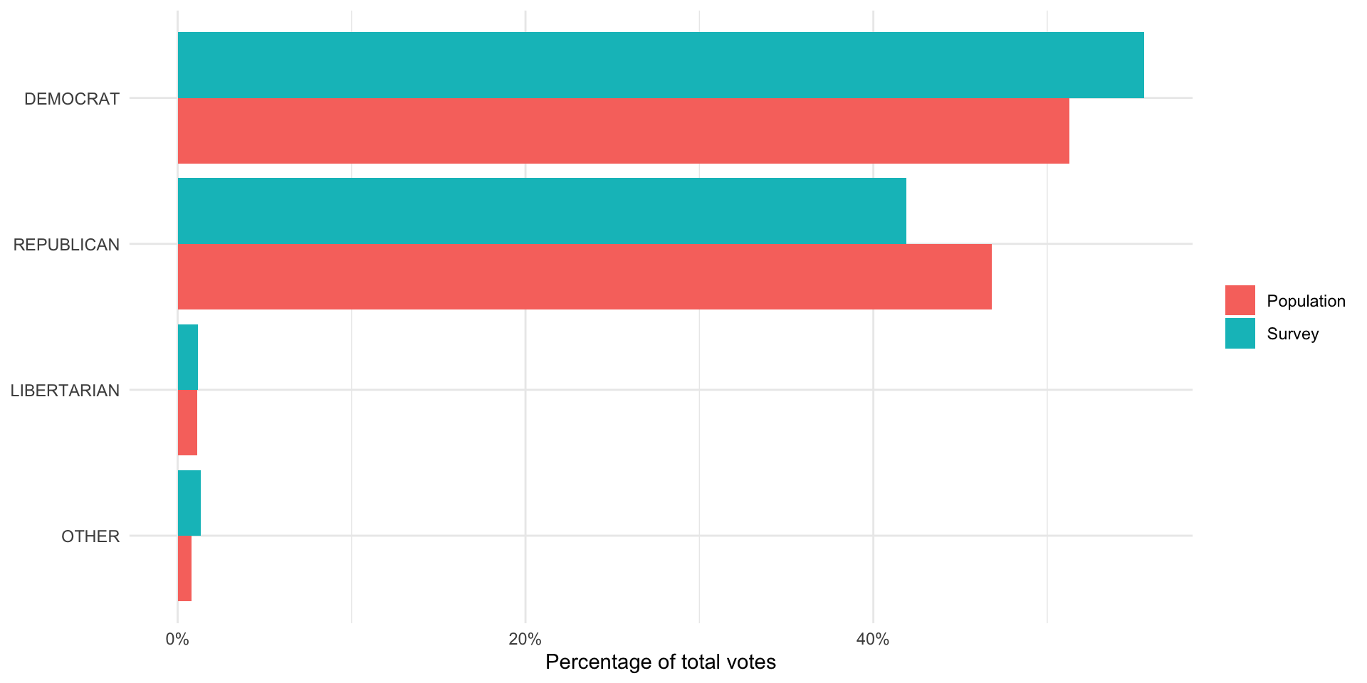 It looks like the ANES did a fairly good job of capturing the US voting population’s behavior. The proportion of survey respondents who said they voted for each candidate (represented by the blue bar) is roughly equal to the proportion of votes won by each candidate (represented by the pink bar).