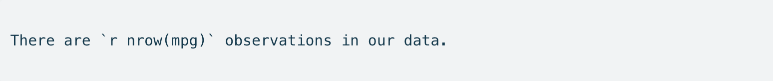 Will render as: There are r nrow(mpg) observations in our data. No need to go and update this reference if that number changes!