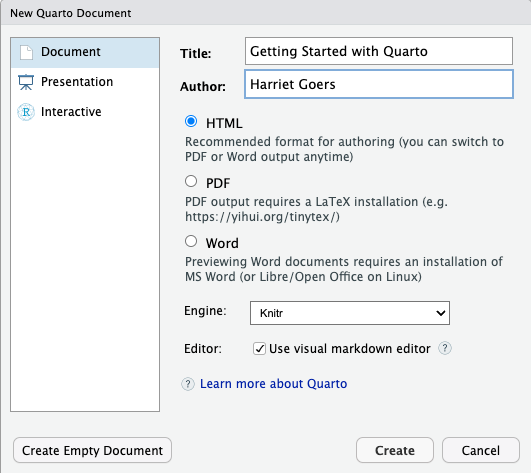 Open up a new Quarto document in RStudio: