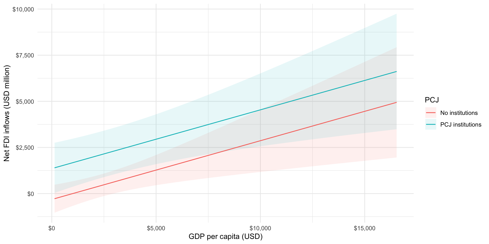 Yes! On average, states that established a PCJ institution received higher net FDI inflows than those states that did not. This difference looks large. It’s $1,763.52 million in net inflows.