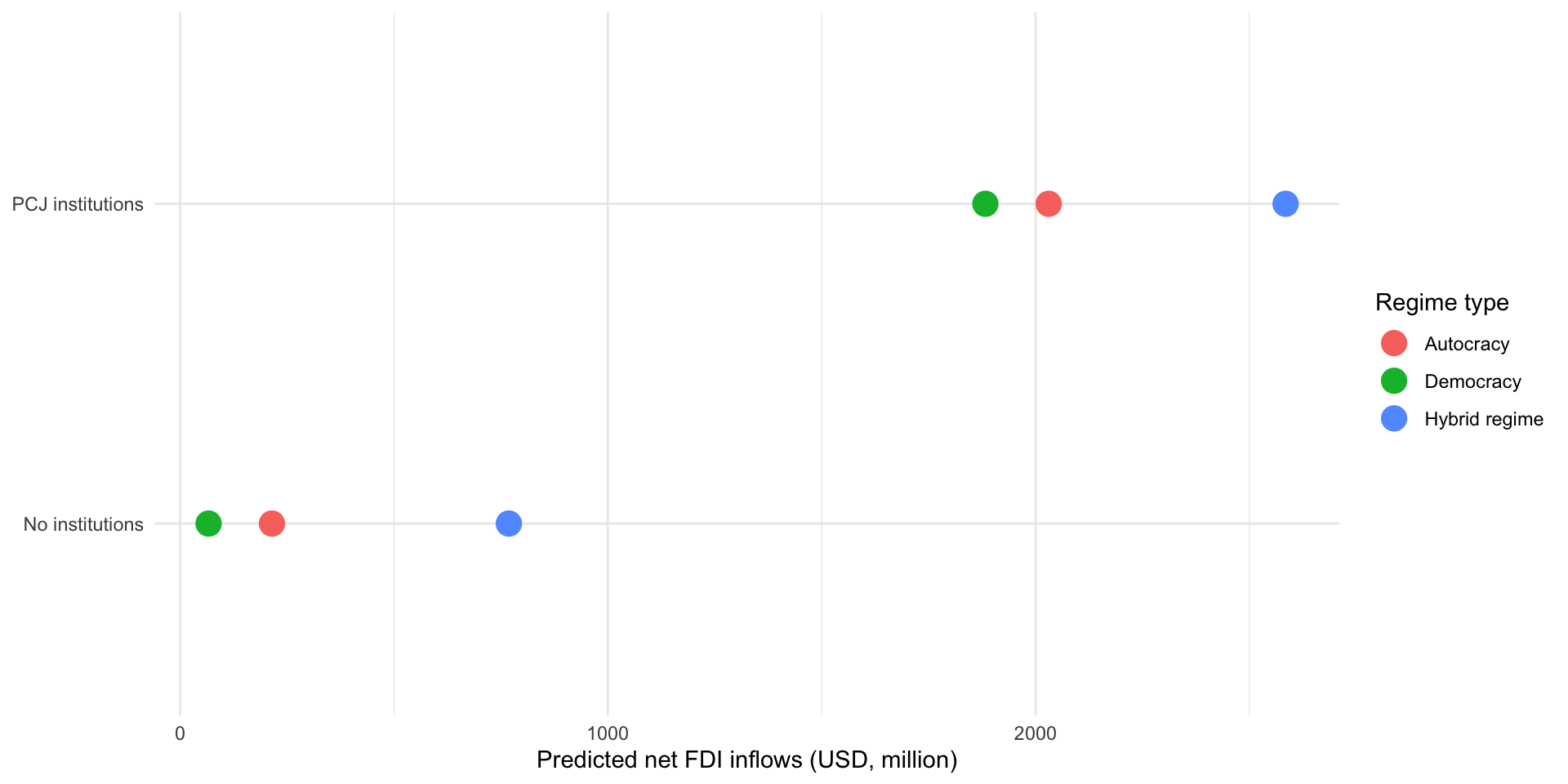 Our model suggests that autocracies (regime_type = "Autocracy") that have not established a commission (pcj = "No institutions") have a predicted average net FDI inflow of $214.55 million.