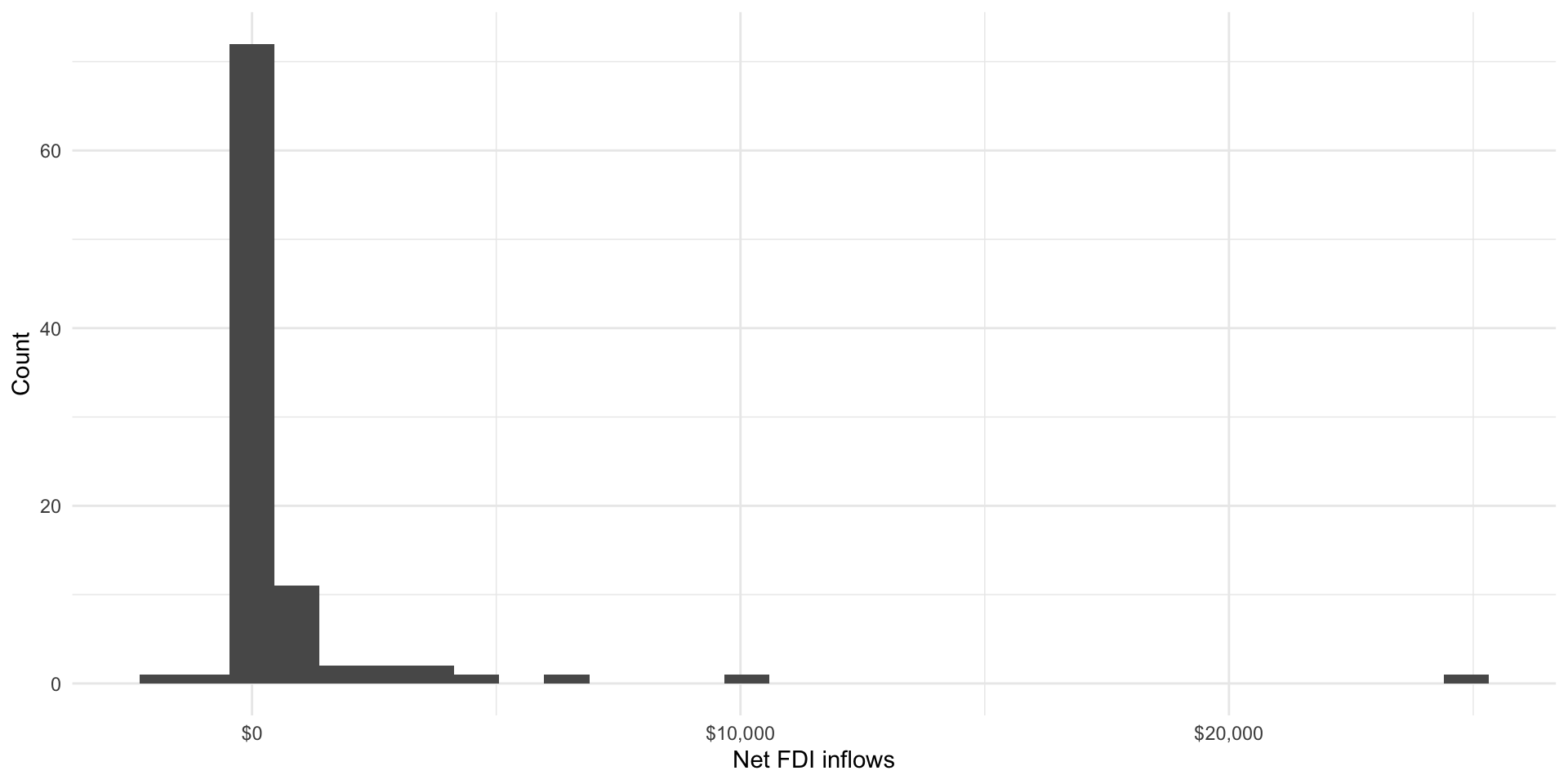 Looking at the histogram above we can see that this average is not a particularly good summary of our data: the majority of countries received a smaller amount of net FDI inflows. The peak the distribution is sitting closer to $0. Looking at the five number summary printed above the histogram we can see that 50 percent of the countries in our sample received between -$0.57 and $408.25 million in net inflows.