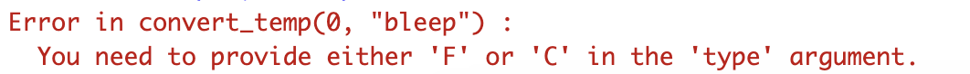 We have included some restrictions on our arguments: users can only supply one of two values: “C” or “F”. However, we have not written very robust code yet. Let’s see what happens when we include something other than “F” or “C” as the type argument:
