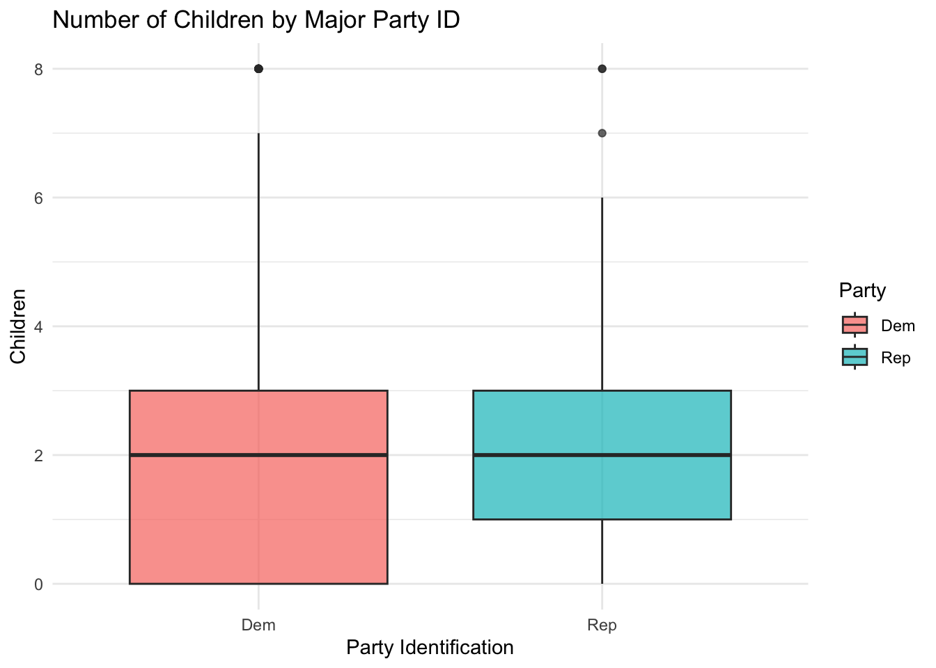 We’ll use partyid_3 (Democrat vs. Republican) and children.